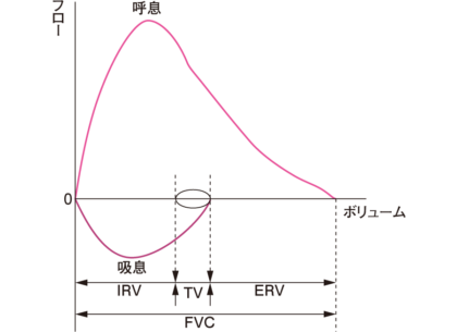 フローボリューム曲線: 最大まで吸い込んだ空気を勢いよく吐き出した際の「空気の速さ(フロー)」と「吐き出した空気の量(ボリューム)」の関係を示したグラフ